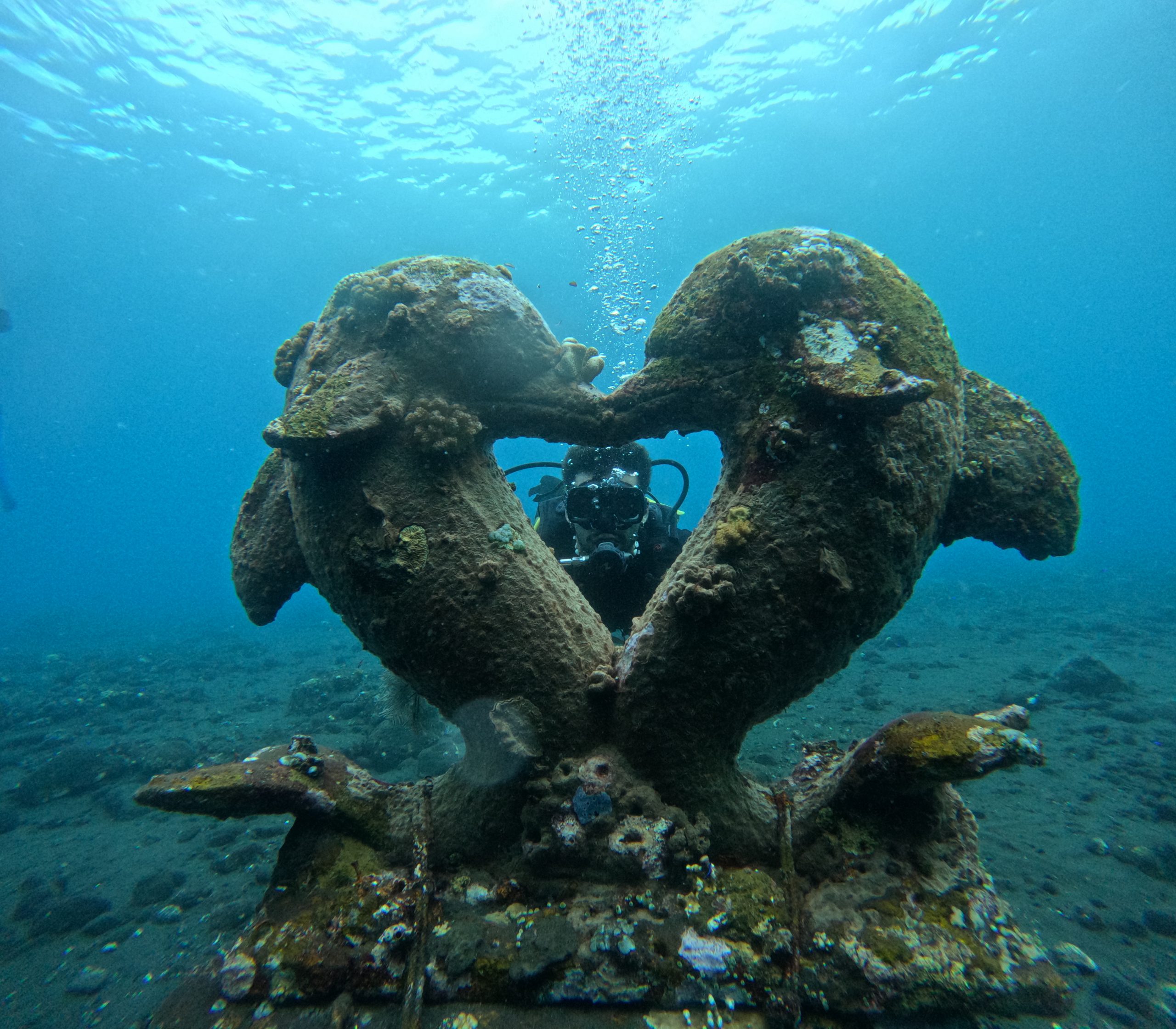 Located just north of Tulamben, the Boga is a decommissioned coastguard supply ship purposefully sunk in September 2012. Stretching 50 meters in length, the wreck rests with its bow at 15 meters and its propeller at around 35 meters. Now home to a growing array of marine life, the Boga features fascinating attractions like a Volkswagen car, a treasure chest, and a serene Buddha statue — making it one of Bali’s most captivating artificial reefs.